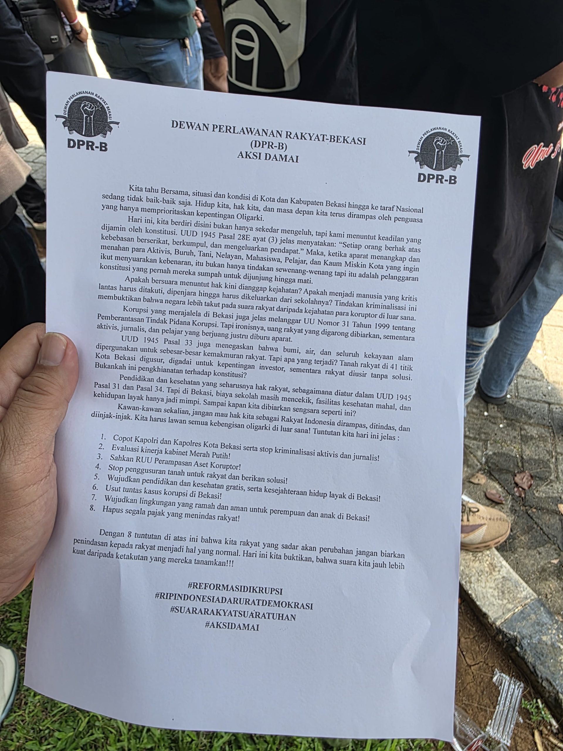 Dalam aksi yang diklaim sebagai ‘aksi damai’ ini, DPR-B menyampaikan delapan tuntutan yang mencakup isu-isu lokal hingga nasional. Para demonstran menegaskan bahwa aksi mereka adalah bentuk perlawanan terhadap situasi yang dianggap ‘tidak baik-baik saja’ di Kota Bekasi maupun di tingkat nasional, di mana hak-hak rakyat dirampas demi kepentingan oligarki.