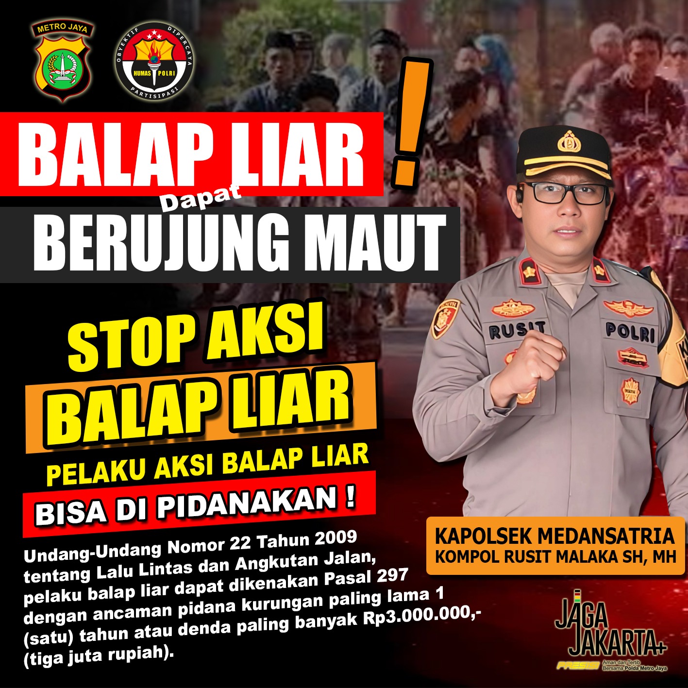Kompol Rusit Malaka menegaskan bahwa pelaku balap liar dapat dijerat dengan sanksi pidana yang cukup berat. Berdasarkan UU No. 22 Tahun 2009 tentang Lalu Lintas dan Angkutan Jalan (LLAJ), khususnya Pasal 297, para pelaku terancam: