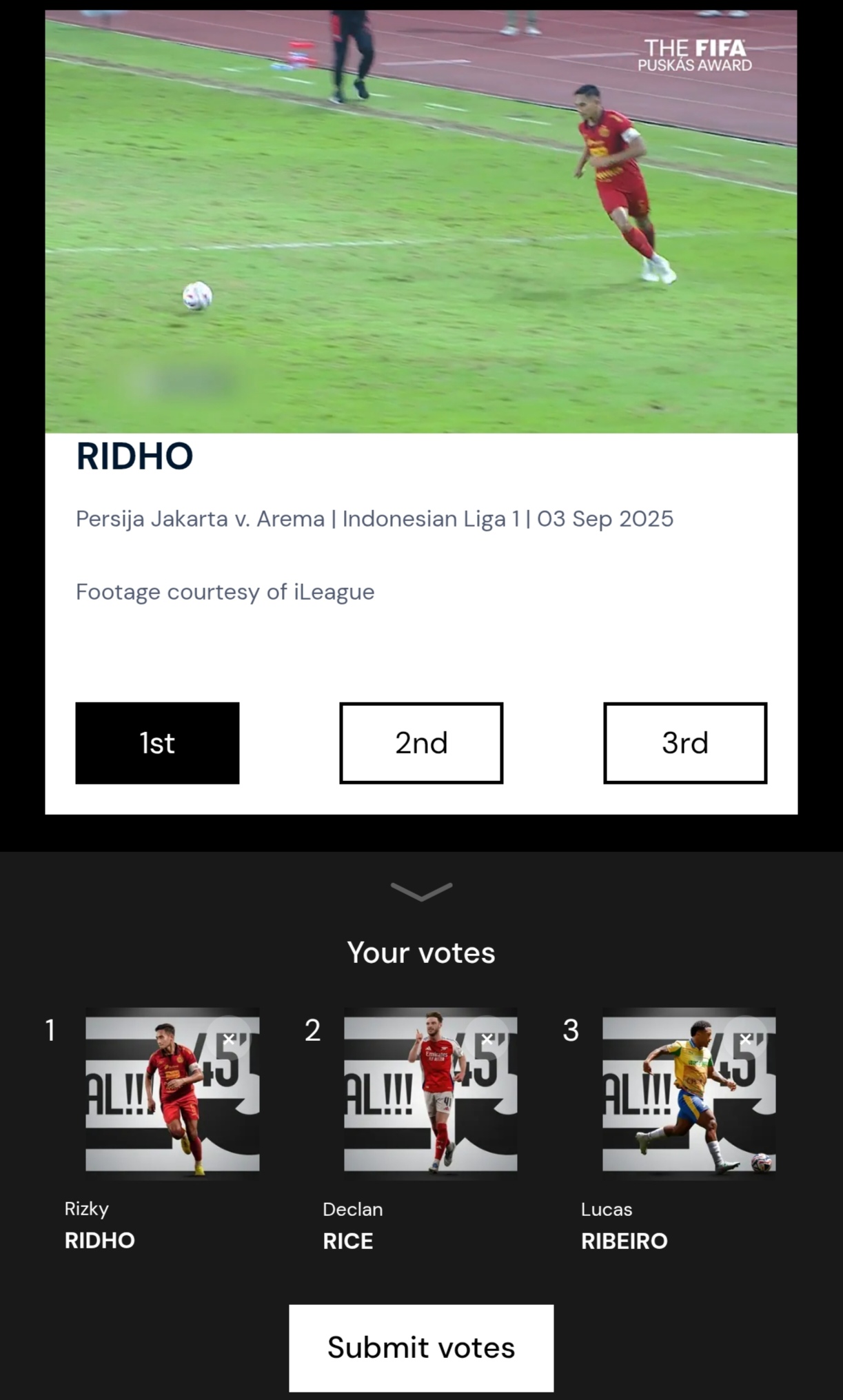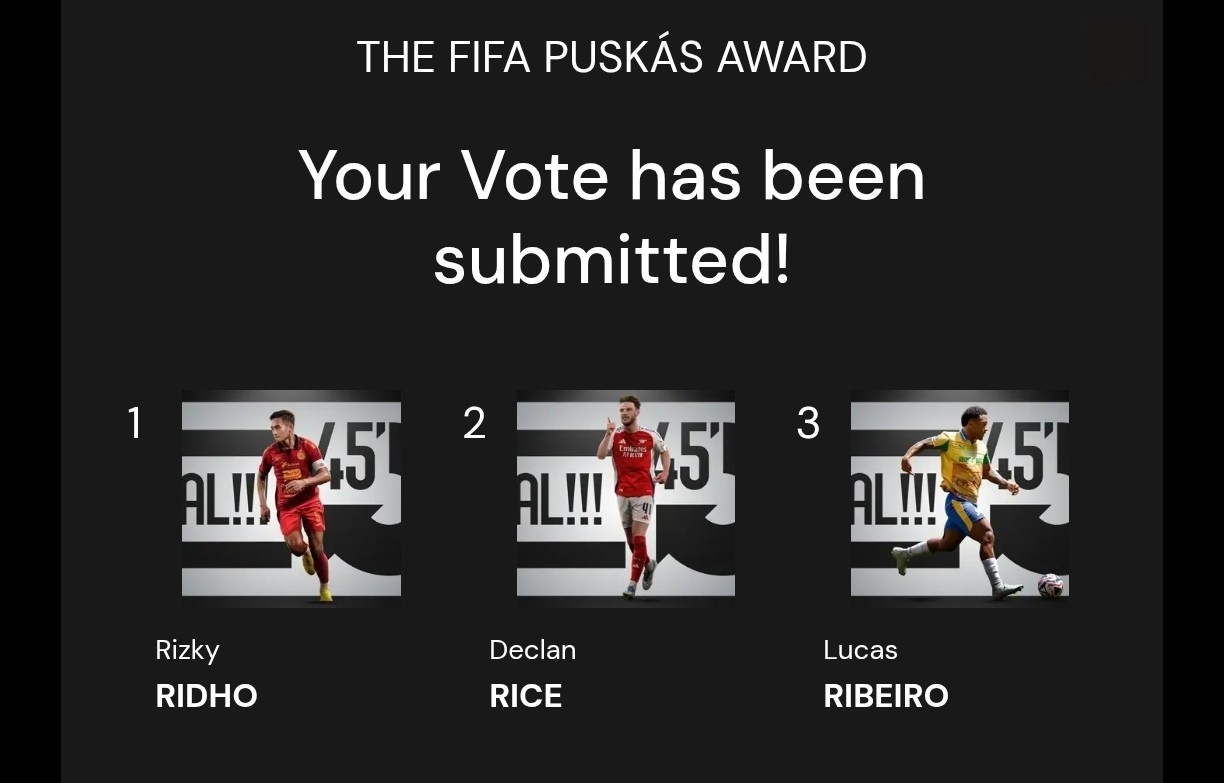 Periode voting telah dibuka sejak Jum’at, 14 November, dan akan berlangsung hingga 3 Desember 2025. Mari kita dukung penuh Rizky Ridho agar bisa membawa pulang trofi penghargaan gol terbaik dunia ini!