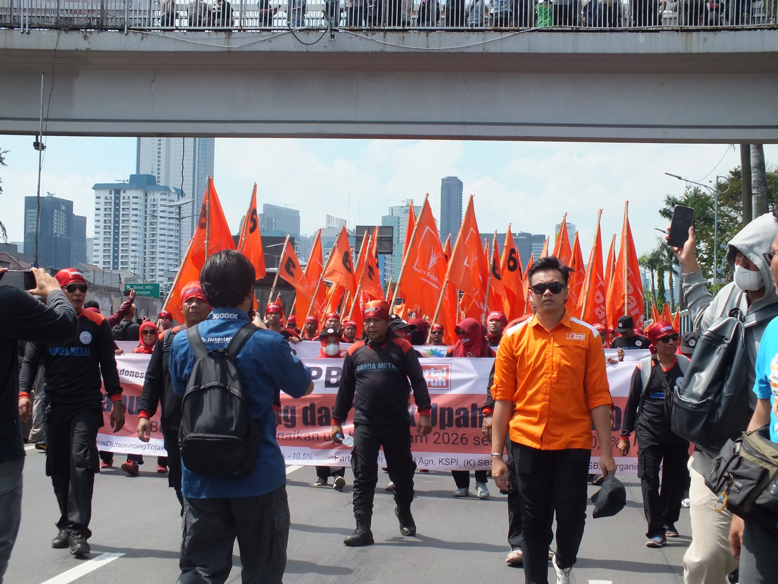 ”Tidak masuk akal upah karyawan di gedung bertingkat kalah dengan pabrik panci di Karawang atau pabrik plastik di Bekasi,” tegas Said Iqbal di tengah aksi massa.