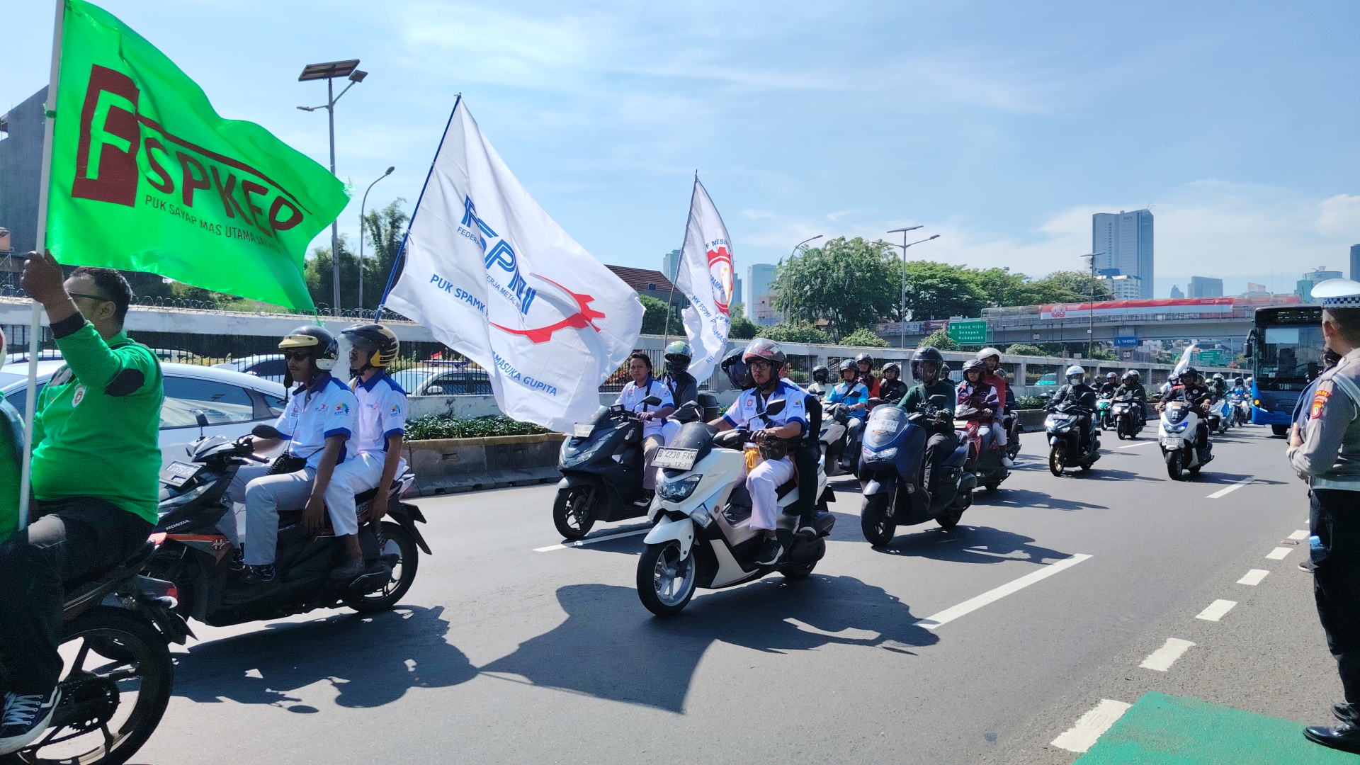 ​Sepuluh menit kemudian, iring-iringan konvoi motor yang membawa bendera serikat pekerja mulai memasuki area tersebut. Kelompok buruh yang datang dari berbagai wilayah ini berkumpul di depan gedung parlemen untuk menyampaikan aspirasi dan tuntutan mereka. Kedatangan massa buruh ini menambah keramaian di lokasi yang sebelumnya tenang.
