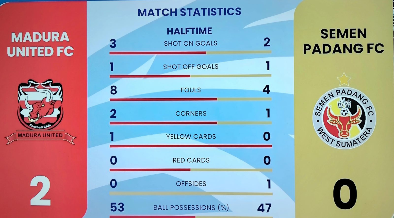 Berdasarkan data statistik pertandingan babak pertama, Madura United memang tampil lebih efektif dan dominan:
