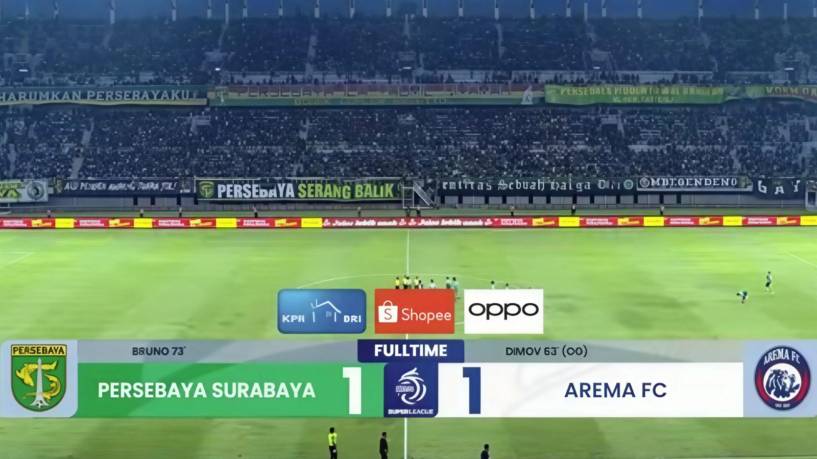 MSIR.COM, Kota Bekasi​Pertandingan klasik bertajuk Derby Jawa Timur antara Persebaya Surabaya (Bajul Ijo) melawan Arema FC (Singo Edan) berakhir tanpa pemenang dengan skor imbang 1-1 dalam lanjutan BRI Super League 2025-2026. Laga sengit yang dihelat di Stadion Gelora Bung Tomo, Sabtu 22/11/2025 Kick-off pukul 15.30 WIB menjadi drama comeback bagi tuan rumah setelah sempat tertinggal.
