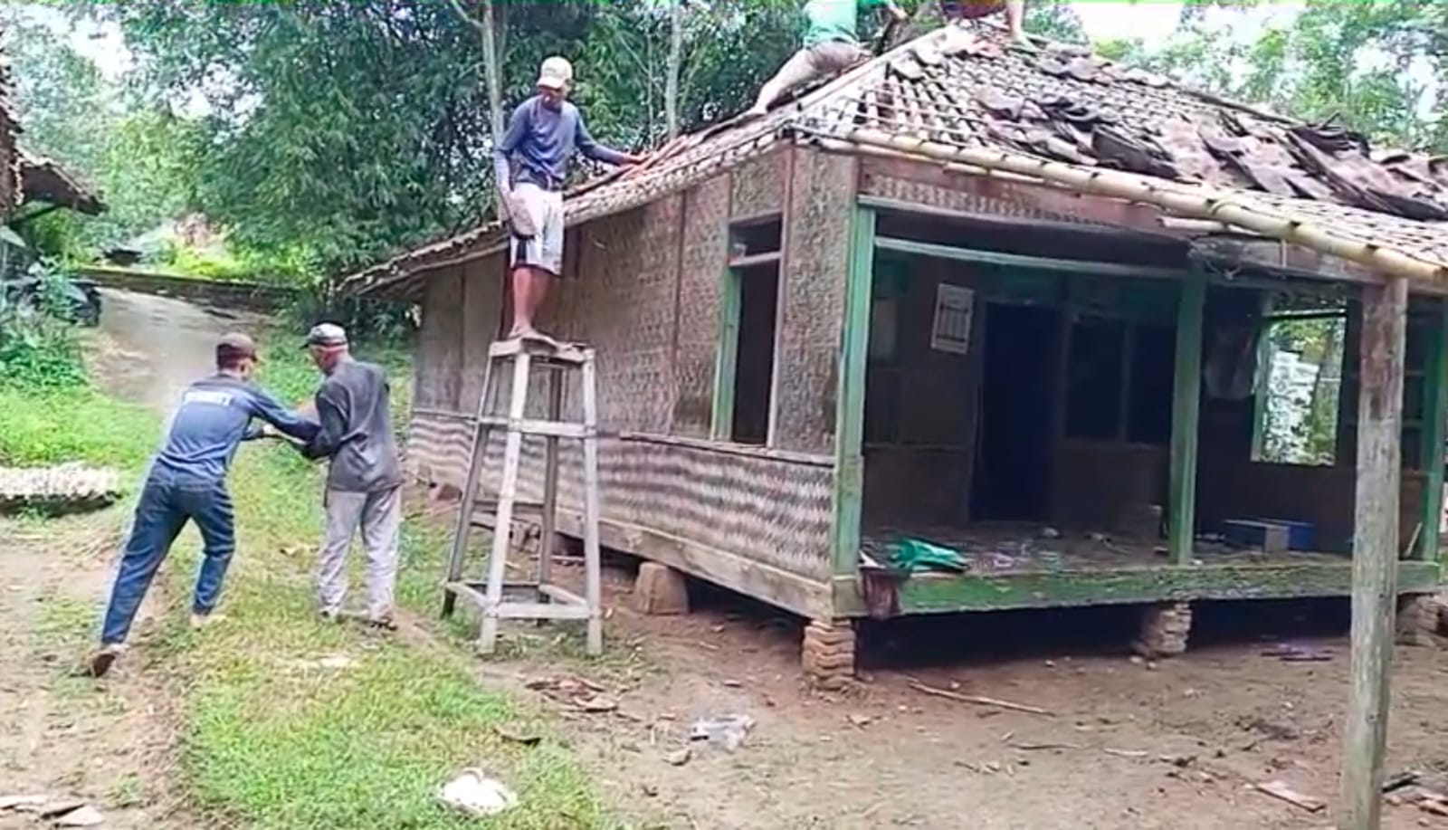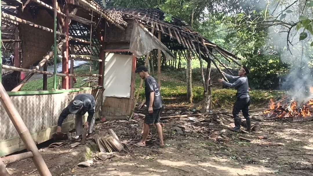 Kegiatan ini juga dihadiri oleh perangkat desa dan warga sekitar. Mereka semua bahu-membahu untuk membongkar rumah Bu Khodijah.