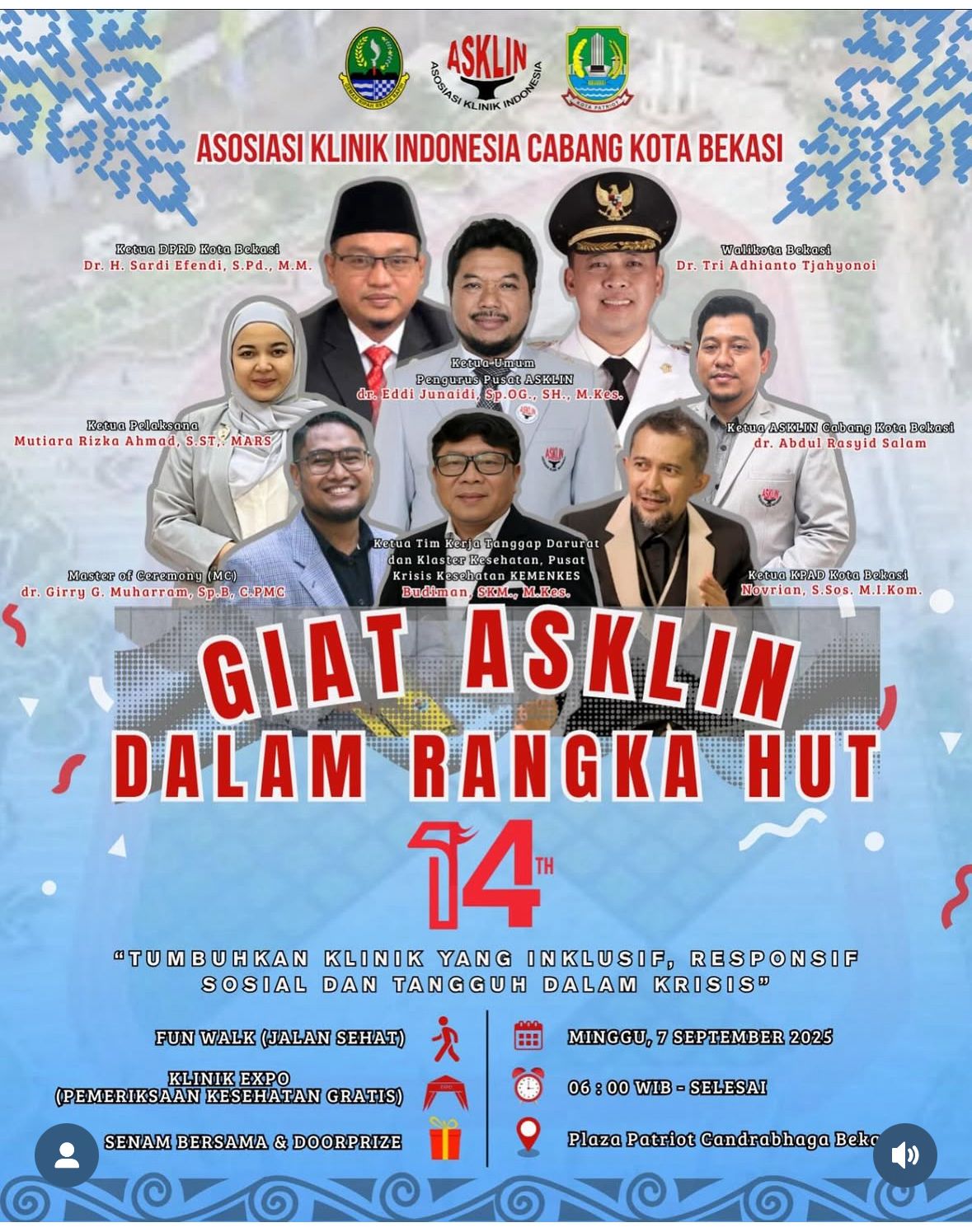 Kota Bekasi , MSIR.COM —Acara perayaan hari ulang tahun ke-14 Asosiasi Klinik Indonesia (ASKLIN) Cabang Kota Bekasi akan digelar pada Minggu, 7 September 2025, di Plaza Patriot Candrabhaga, Kota Bekasi. Acara yang dimulai pukul 06.00 WIB ini mengusung tema “Tumbuhkan Klinik yang Inklusif, Responsif Sosial dan Tangguh dalam Krisis”.