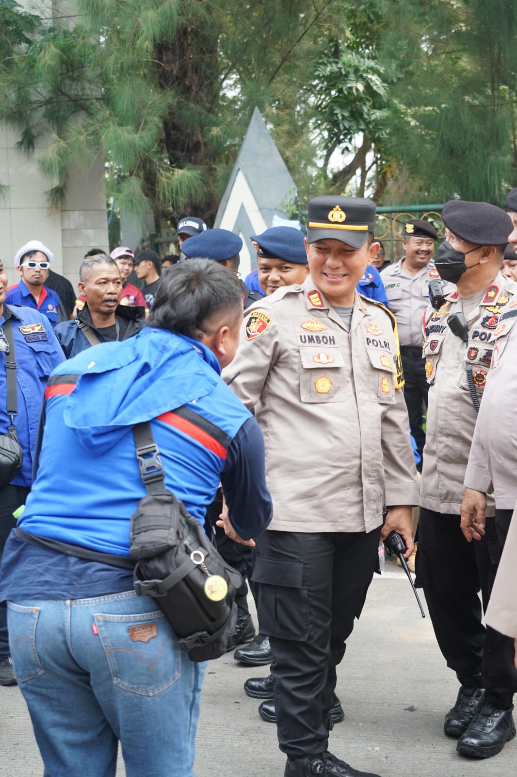 Di sela-sela jalannya aksi, Kapolsek Cikarang Pusat AKP Elia Umboh turun langsung menyapa massa. Dengan sikap ramah dan penuh keakraban, ia menyampaikan pesan kamtibmas agar peserta aksi tetap menjaga ketertiban, tidak terpancing provokasi, dan menyampaikan aspirasi secara damai.