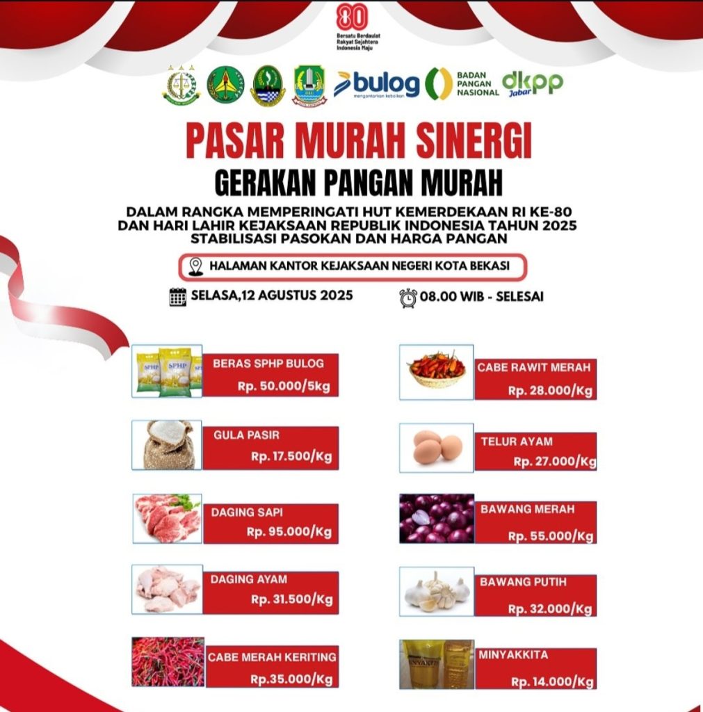 Acara yang dimulai pukul 08.00 WIB, Selasa 12/8/2025 ini merupakan hasil kolaborasi dengan berbagai instansi dan komunitas, seperti Bulog Cabang Karawang-Bekasi, Dinas Ketahanan Pangan, Pertanian dan Perikanan Kota Bekasi, Dinas Perindustrian dan Perdagangan, Diskominfo Kota Bekasi, serta UMKM Ikatan Adhyaksa Dharmakarini Daerah Kota Bekasi dan Komunitas UMKM Kota Bekasi.
