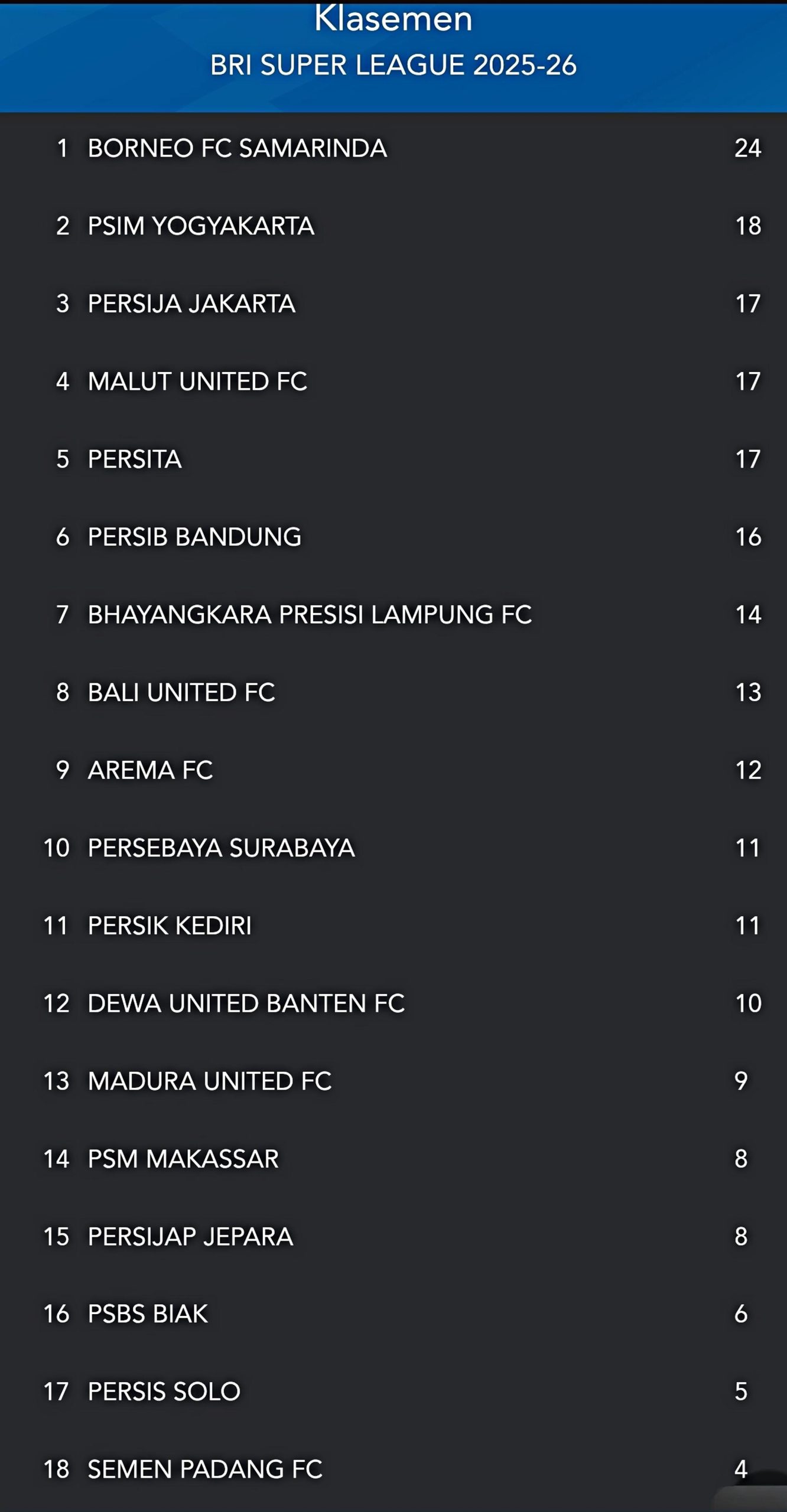 Kemenangan ini menjadi tonggak penting bagi Laskar Mataram julukan PSIM YOGYAKARTA kini mengoleksi 18 poin, melompat ke posisi 2 klasemen BRI Super League 2025-2026. Sementara itu, Macan Putih julukan Persik Kediri tertahan di urutan 11 dengan koleksi 11 poin. [■]