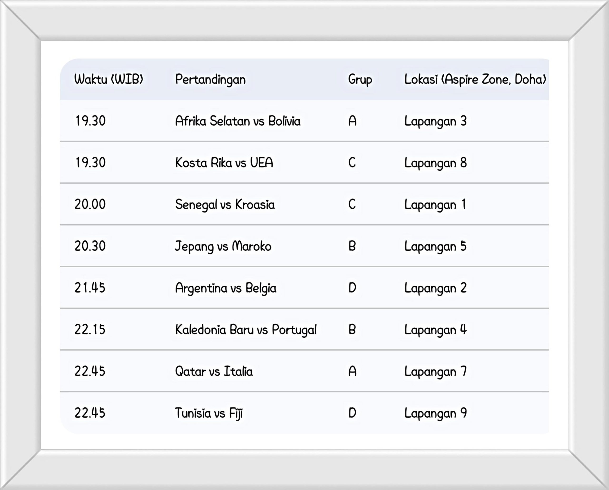 Sorotan utama tentu tertuju pada tim-tim unggulan dan tuan rumah. Salah satunya adalah bentrok seru dari Grup D antara Argentina U-17 melawan Belgia U-17 pada pukul 21.45 WIB. Tidak kalah menarik, tim tuan rumah Qatar U-17 akan langsung diuji oleh kekuatan Eropa, Italia U-17, yang dijadwalkan bermain pada pukul 22.45 WIB.