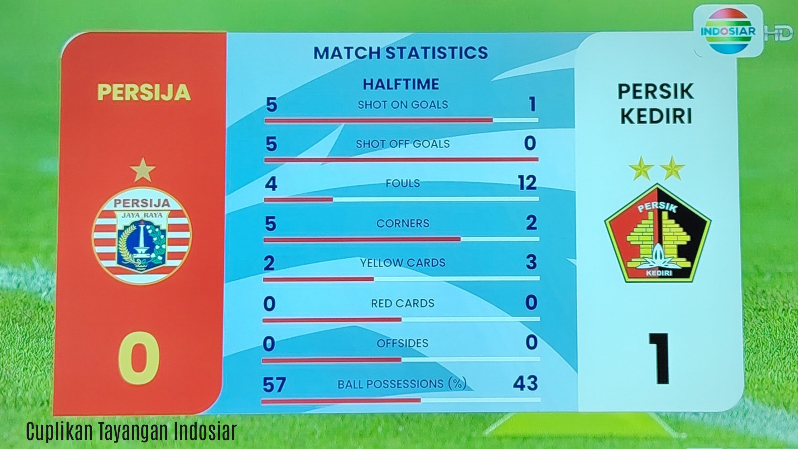 Namun, efektivitas menjadi milik Macan Putih, Persik Kediri. Walaupun hanya mencatatkan 1 kali tembakan tepat sasaran, peluang tunggal itulah yang berhasil dikonversi menjadi gol, membuat kiper Persija takluk.