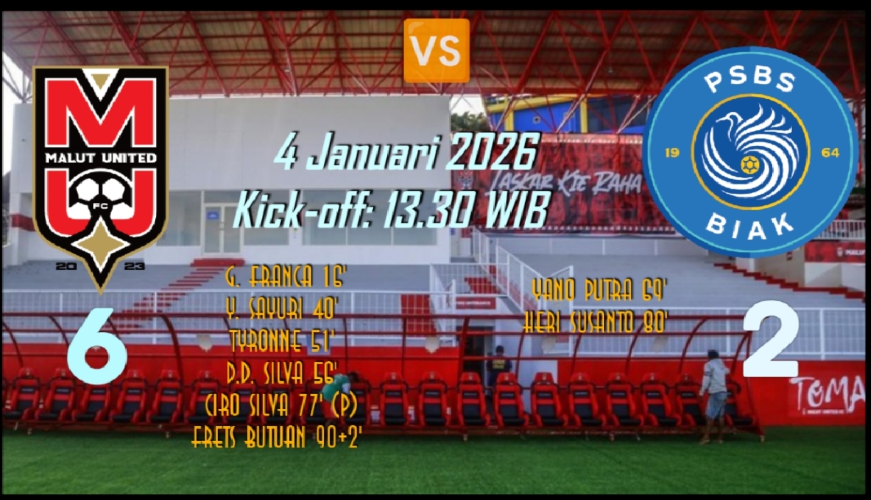 MSIR.COM, Kota BekasiStadion Kie Raha menjadi saksi keganasan Malut United dalam lanjutan pekan ke-16 BRI Super League 2025-2026. Menjamu PSBS Biak pada Minggu 4/1/2026, skuad asuhan Hendri Susilo sukses mengamankan kemenangan telak 6-2.