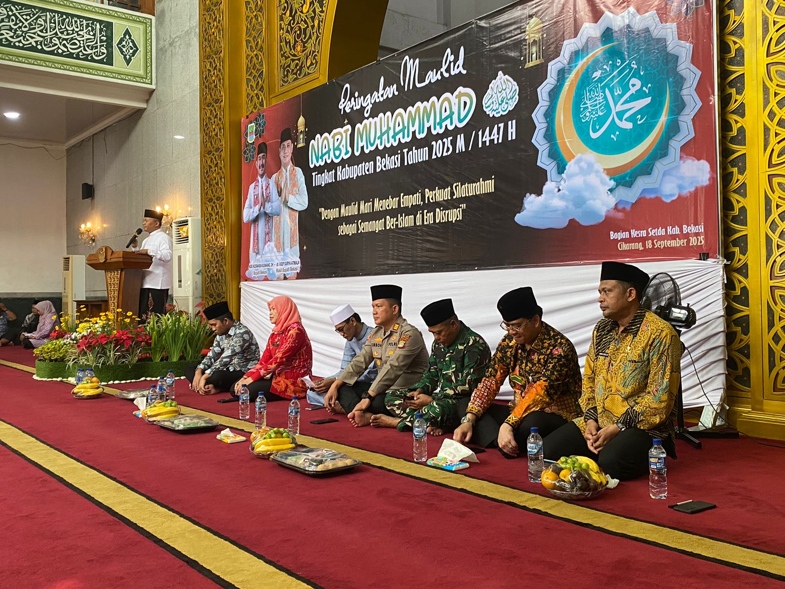 Kabupaten Bekasi , MSIR.COM —Peringatan Maulid Nabi Muhammad SAW Tingkat Kabupaten Bekasi Tahun 2025 digelar dengan penuh khidmat di Masjid Nurul Hikmah, Komplek Perkantoran Pemerintah Kab. Bekasi, Ds. Sukamahi, Kec. Cikarang Pusat, Kabupaten Bekasi, Kamis (18/9/2025). Kegiatan ini dihadiri oleh sekitar 500 orang, termasuk pejabat pemerintah, tokoh ulama, dan masyarakat.