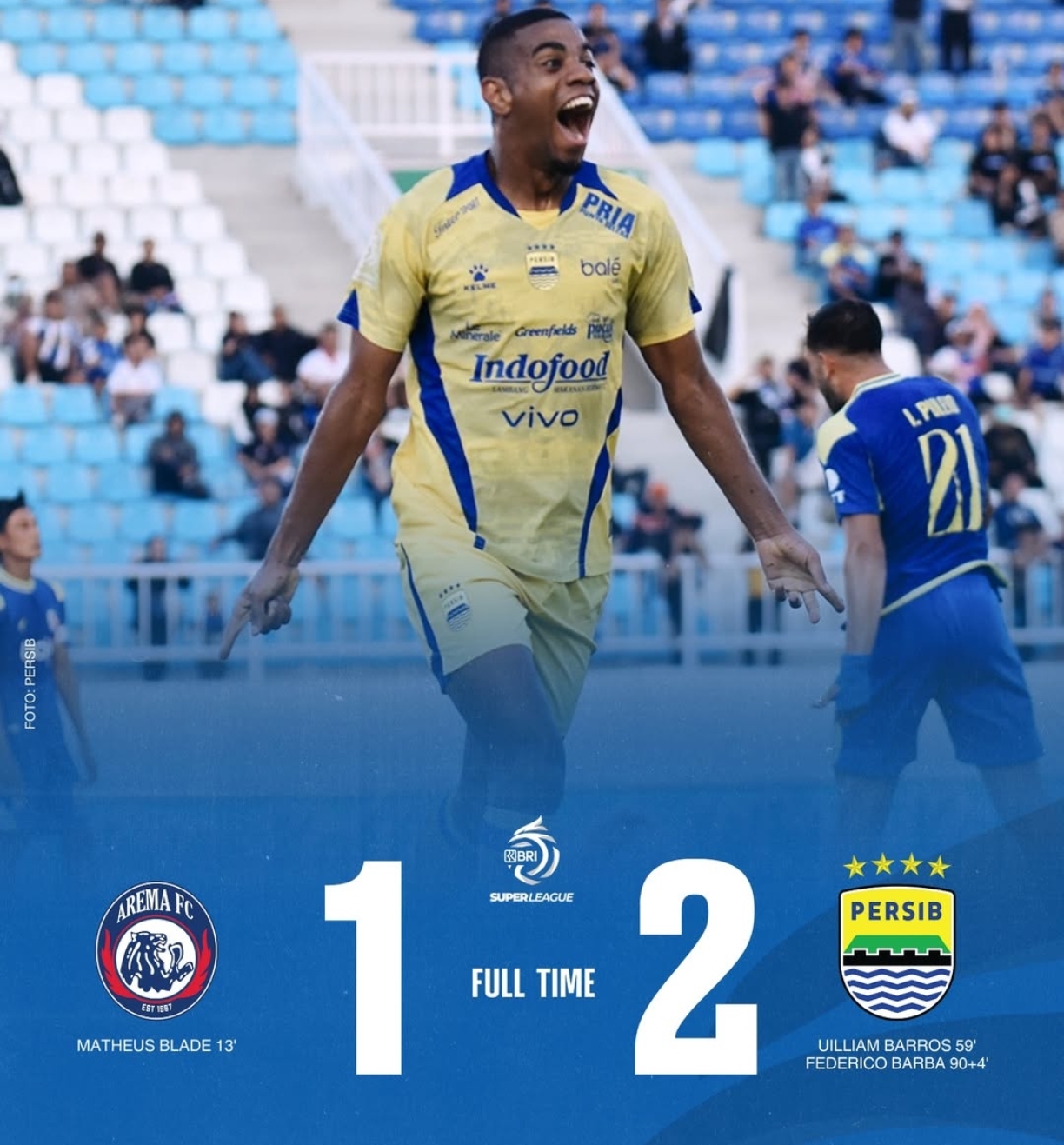 Hingga peluit panjang berbunyi, skor tidak berubah. Kemenangan dramatis ini membawa Persib naik ke posisi keempat klasemen sementara dengan koleksi 10 poin. Sementara itu, kekalahan ini menahan Arema FC di posisi kedelapan dengan 8 poin. [■]