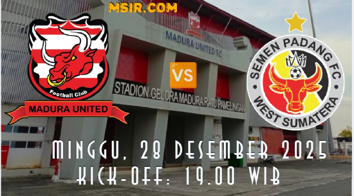 MSIR.COM, Kota Bekasi —Stadion Gelora Madura Ratu Pamelingan (SGMRP) bersiap menggelar partai emosional bagi publik Pulau Garam. Madura United dijadwalkan menjamu Semen Padang dalam laga tunda pekan ke-8 BRI Super League 2025-2026 pada Minggu 28/12/2025 Kick-off pukul 19.00 WIB duel ini disiarkan langsung oleh televisi nasional Indosiar.