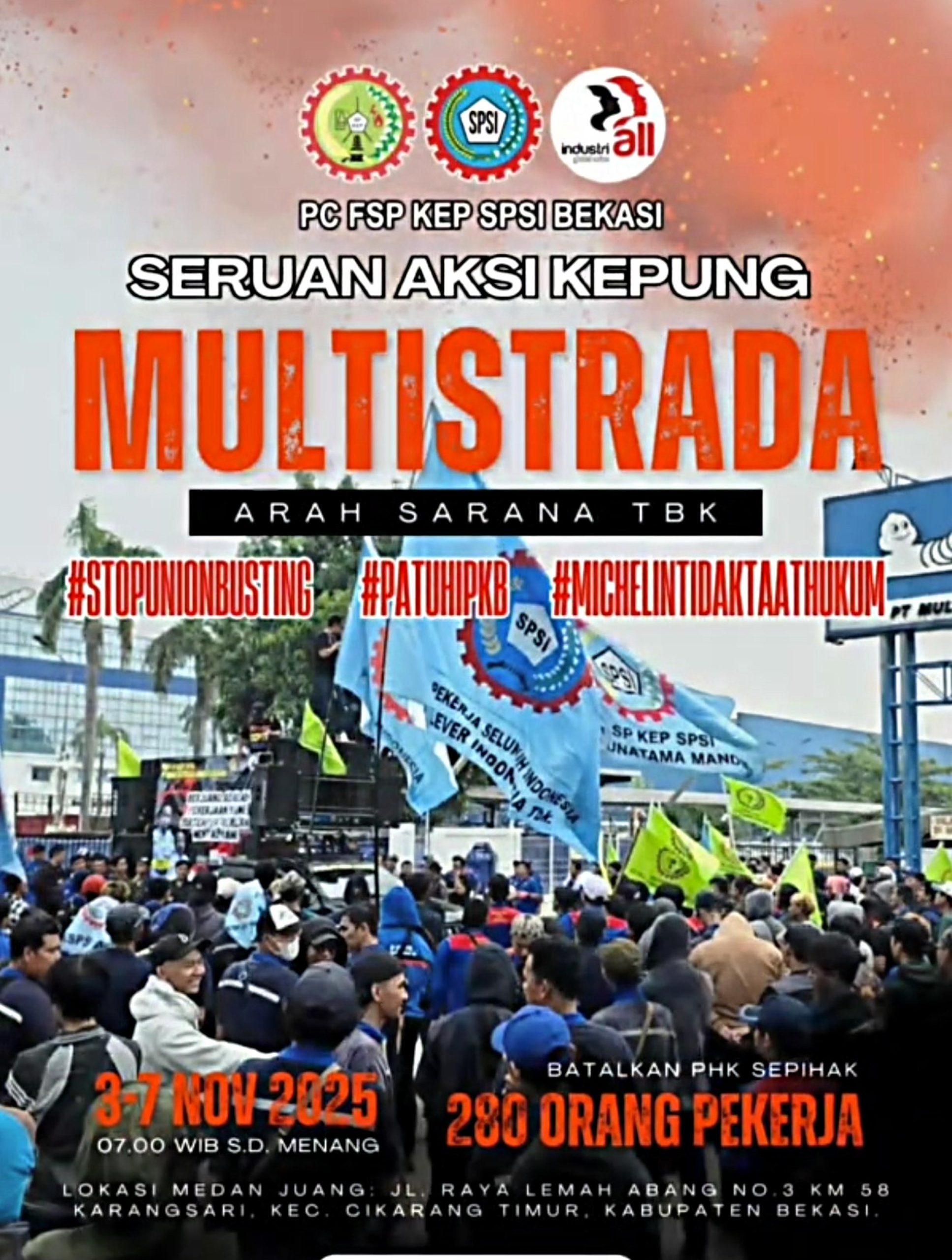 1. Batalkan PHK Sepihak: Mendesak manajemen PT Multistrada (Michelin) untuk mencabut keputusan PHK terhadap 280 pekerja.