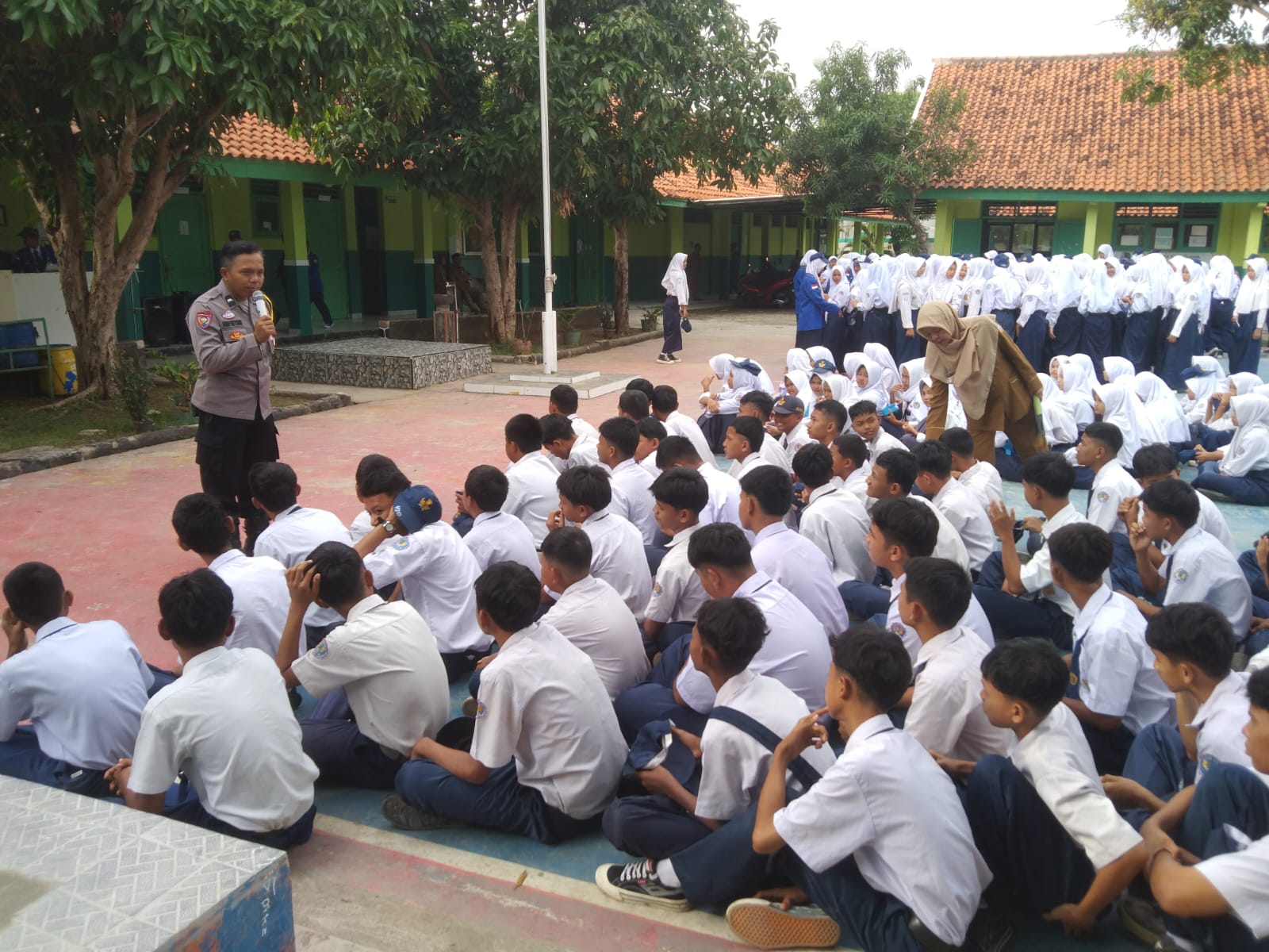 AIPDA Nurfriyono, anggota Binmas Polsek Cikarang Pusat, menyampaikan pesan kamtibmas kepada siswa. Ia mengingatkan agar siswa tidak terlibat dalam kenakalan remaja seperti tawuran dan penggunaan obat terlarang.