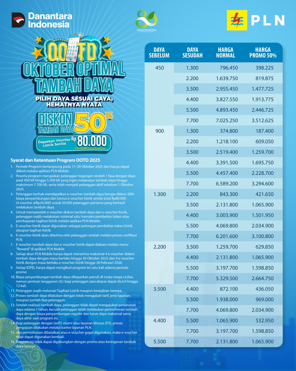 Program ini berlaku bagi pelanggan tegangan rendah satu fasa dengan daya awal 450 VA hingga 5.500 VA, yang ingin menambah daya hingga maksimal 7.700 VA. Selain potongan 50 persen biaya penyambungan, pelanggan juga berkesempatan mendapatkan e-voucher listrik senilai Rp80.000 bagi 50.000 pendaftar pertama, yang dapat digunakan untuk pembelian token listrik.
