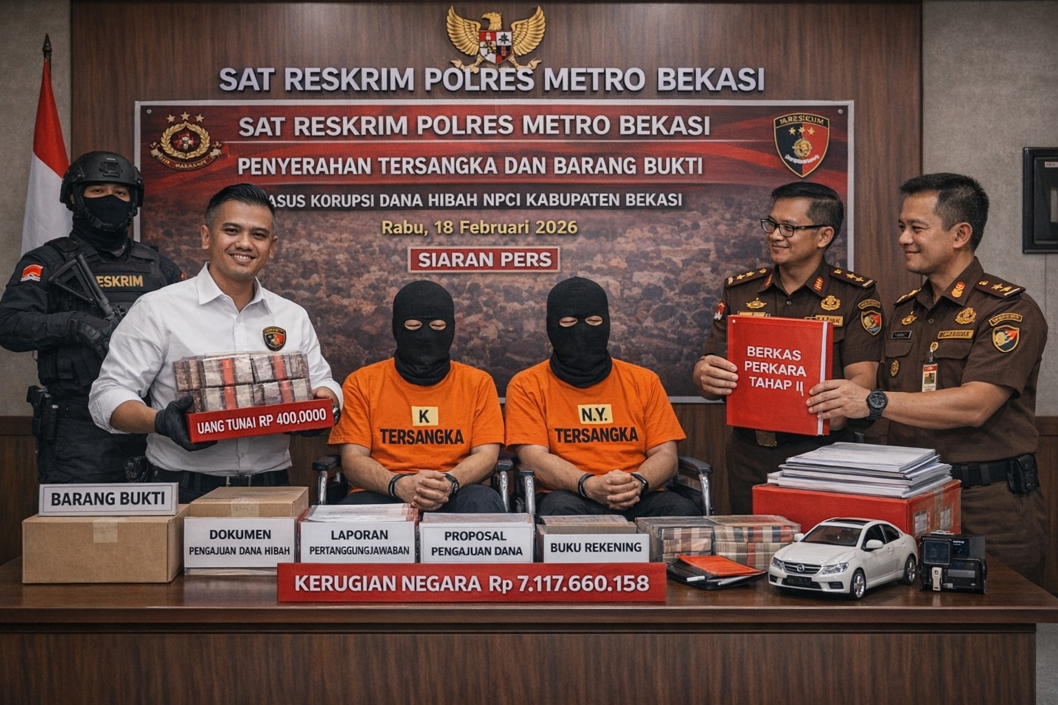 MSIR.COM, Kabupaten Bekasi — Satuan Reserse Kriminal Polres Metro Bekasi, jajaran Polda Metro Jaya, melaksanakan penyerahan tersangka dan barang bukti (Tahap II) dalam perkara dugaan tindak pidana korupsi penyalahgunaan dana hibah yang bersumber dari APBD dan APBD Perubahan Kabupaten Bekasi Tahun Anggaran 2024 untuk kegiatan National Paralympic Committee Indonesia (NPCI) Kabupaten Bekasi pada Rabu, (18/02/2026).