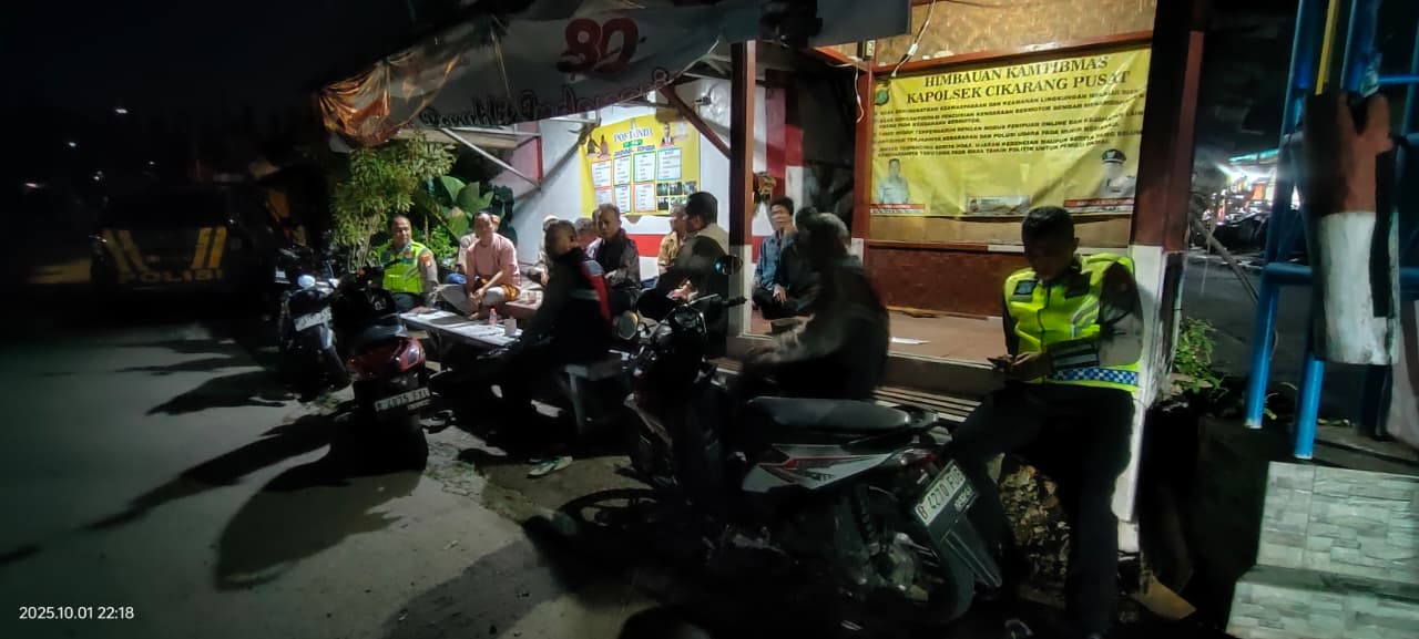 MSIR.COM, Kabupaten Bekasi —Polsek Cikarang Pusat menggelar kegiatan Ngopi Kamtibmas (Ngobrol Santai Kamtibmas) bersama tokoh masyarakat dan warga di Pos Satkamling Kp Tembong Gunung Rt.02/02 Desa Sukamahi Kecamatan Cikarang Pusat Kabupaten Bekasi pada Rabu (1/10/2025) malam.