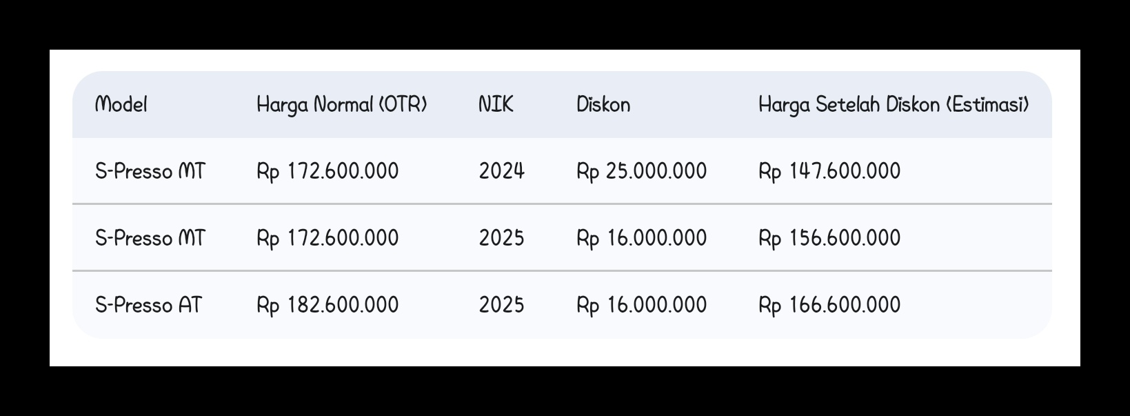 Poin Utama: Dengan skema diskon ini, S-Presso kini bisa dibawa pulang dengan harga mulai dari Rp 147 jutaan. Pencapaian harga ini menjadikannya salah satu opsi city car paling terjangkau dan patut dipertimbangkan di Indonesia menjelang pergantian tahun.